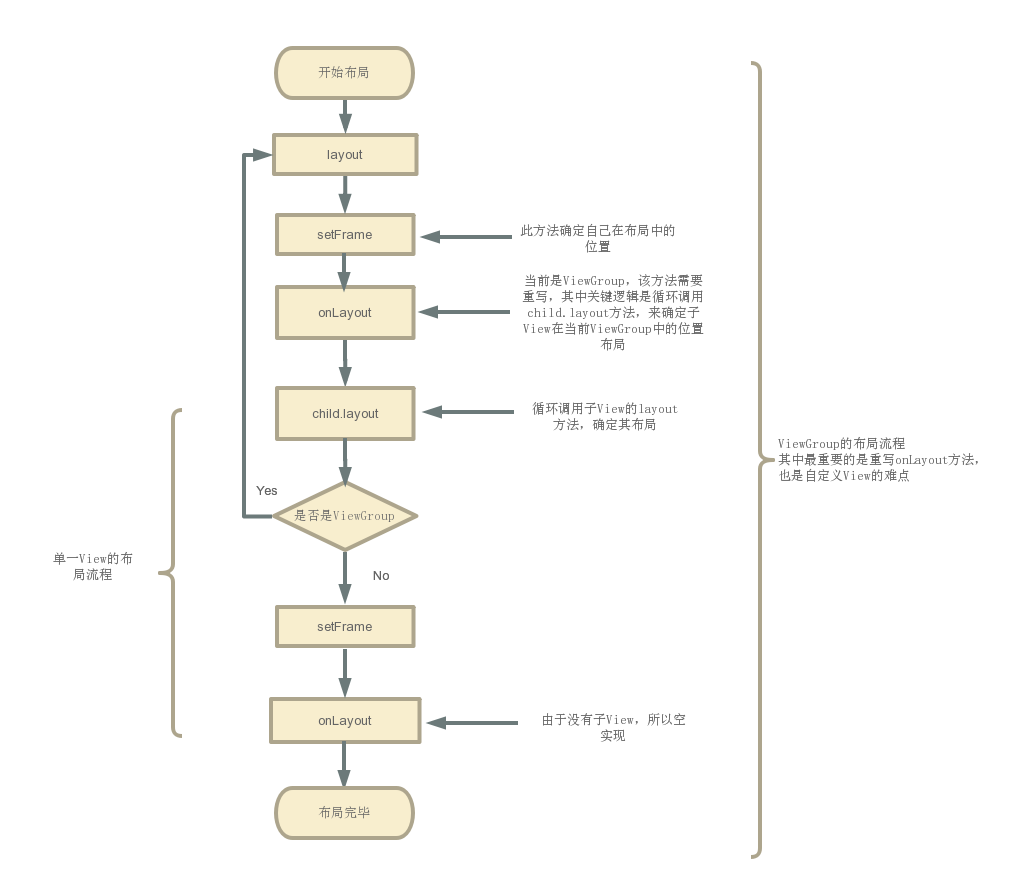 Layout 也是从父容器到子组件的顺序,不同的是 ViewGroup 先在 layout() 中确定自己的布局,然后在 onLayout() 方法中再调用子 View 的 layout() 方法,让子 View Layout 出来。在 Measure 过程中,就如上面一节提到的,ViewGroup 一般是先测量子 View 的大小,然后再确定自身的大小。