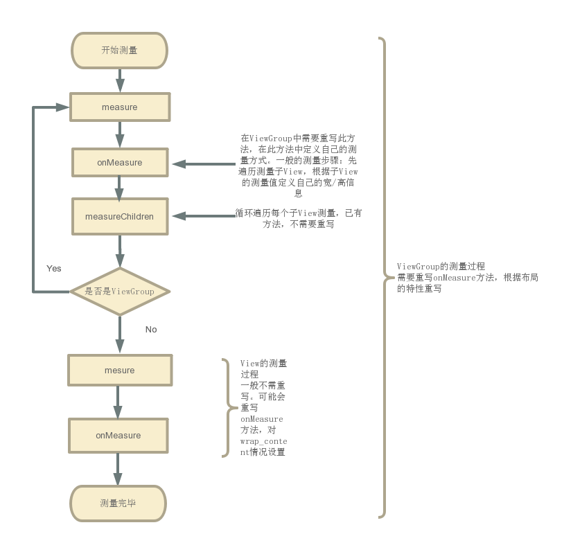 - 对于 ViewGroup,若不重写,就会执行和单一 View 中相同逻辑,不会测量子 View。一般会重写